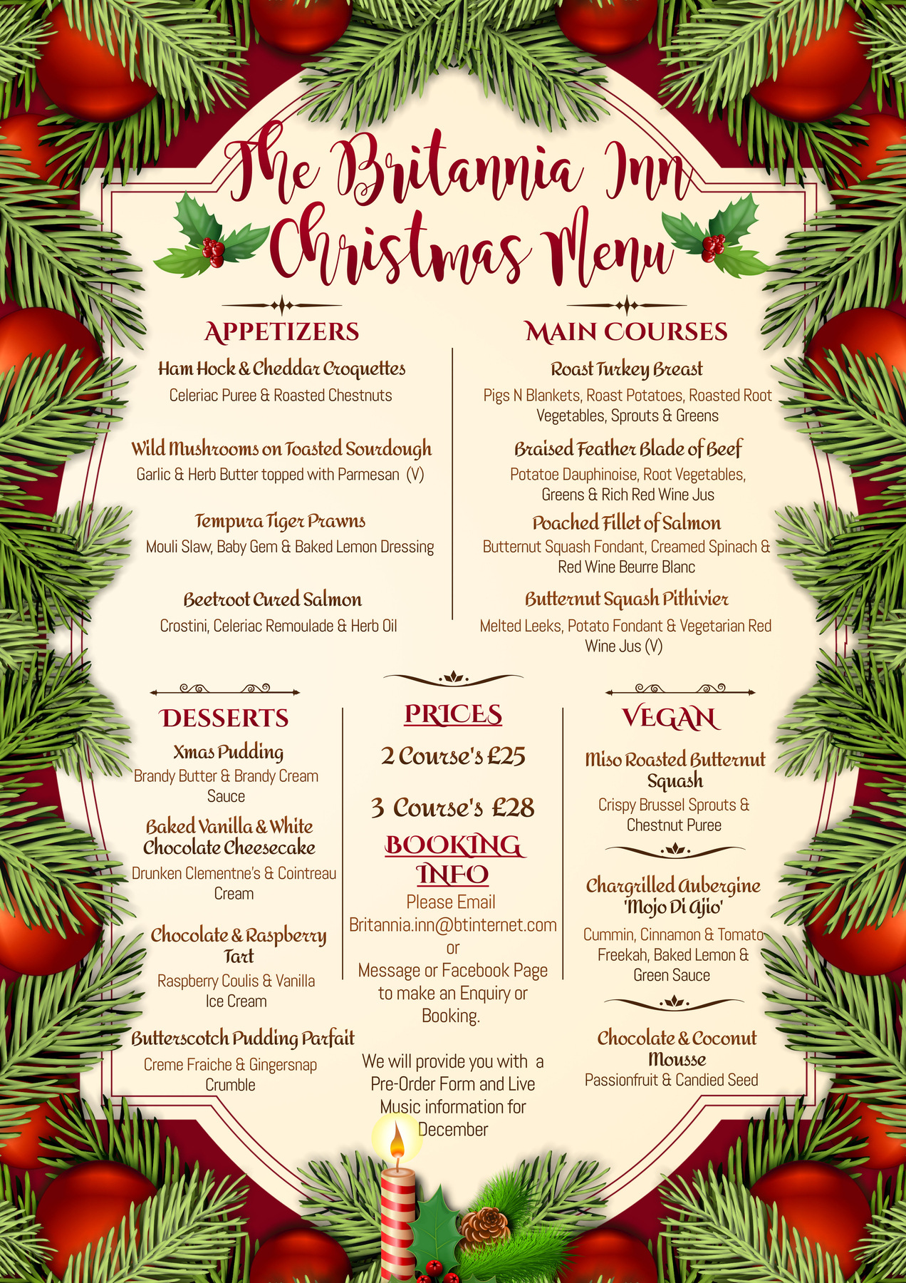 For Bookings please email Britannia.inn@btinternet.com or message us on Facebook HERE